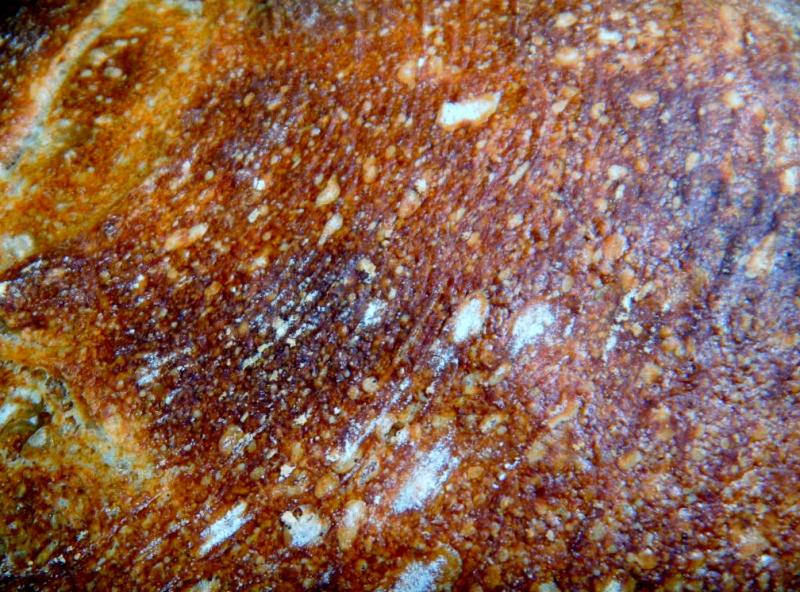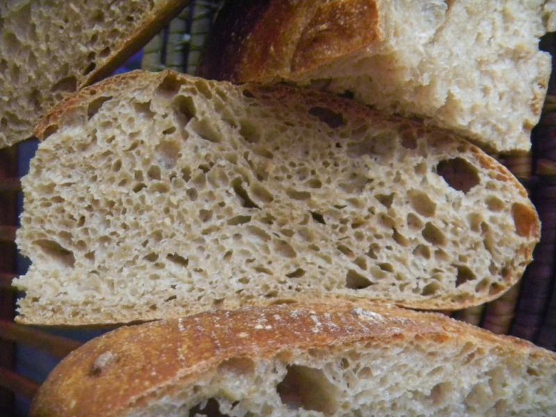 The bread browned nicely with small blisters, sprang back nicely and blooms a bit. What it did best is spread. This was ‘one wet dough’, no amount of cold could get it to keep from oozing once unchained from the basket. Still, the crumb as open for 50% while grain bread and we were pleased but not as open as the 30% whole grain version – no surprise there. We like this bread a lot. It was very soft and moist on the inside with a chewy soft crust as it cooled.