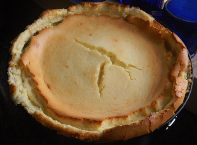That Mexican Squash pie is delicious as is the Lemon Cheese souffle. The problem with the souffle is that I forgot spray the pan with non stick so the batter closest to the pan stuck before the egg whites exploded causing the souffle to double in height and rip itself all around the perimeter where it stuck to the pan. Never forget to spray your pan when making this souffle. But it is worse. Here is a picture of the cooled souffle where it sunk back to its normal level and then cracked across the middle at the same time! Oh well, next time we will spray the pan.