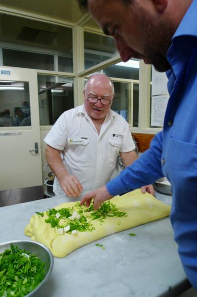 Michael one of Challengers' chefs adding cheese and spring onions into the last few folds