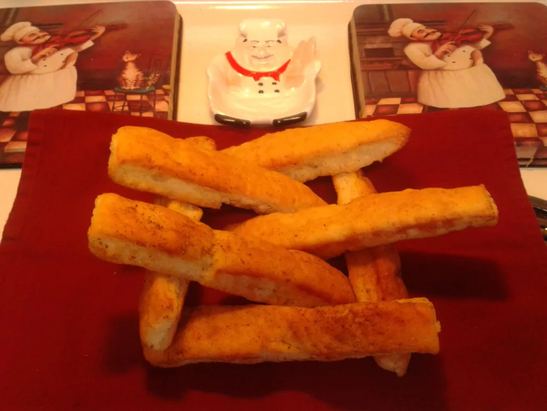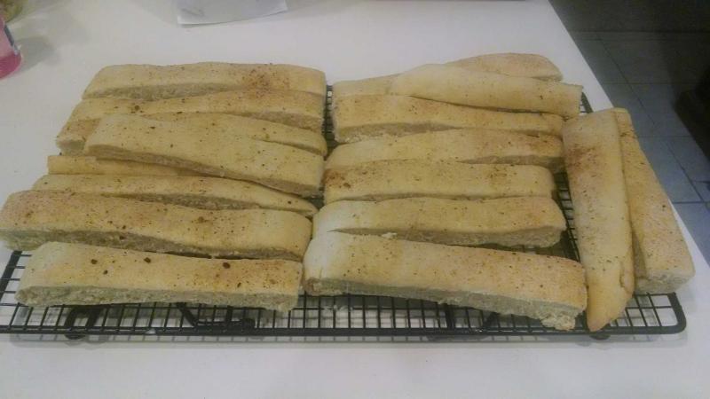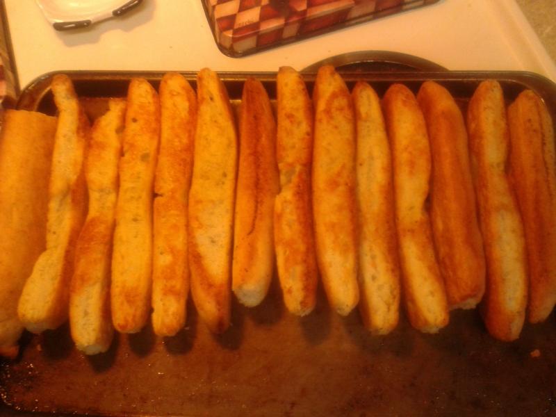 Here is the picture of the toasted sides. This recipe calls for scoring the breadsticks and then turning the slices on their sides and finishing baking that way like one would biscotti. I made half of mine with garlic salt and half with a pizza spice that I made from a recipe on Food.com.