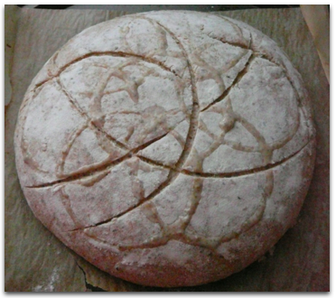 The loaf is decorated with a slurry of rye, water, lemon juice, active malt, salt.  A small coffee cup transferred the "rings" from the plate of slurry to the flour dusted loaf.  Scoring could have been a bit deeper but I'll take it.