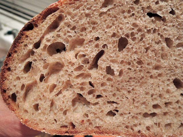 When sliced, the crust was chewy except for the ears which crunched. The crumb was well aerated but without very large holes. Reviewing the various blog postings on this bread, all of the variations have about the same type of crumb. The high hydration level promotes bigger holes, but the high percentage of whole grain flours works against them. In any case, this is a great crumb for sandwiches and for toast.