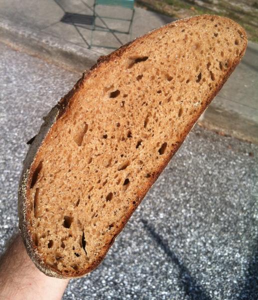 Yeah, I would have liked some bigger holes, too.. though I expected the crumb to be a little tighter, given the flours I used. As for the 90% hydration... I just wanted to try it! My usual for my standard whole-wheat loaf is 80% and it is always much easier to handle than my mostly white flour doughs. I figured this dough could take the higher hydration. I think I will try an overnight, cold final proofing next time to see how that effects the crumb.