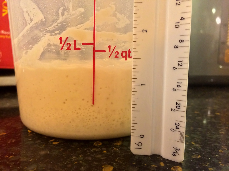 With regard to my little experiment, the two containers began with exactly the same amount of starter, flour and water.