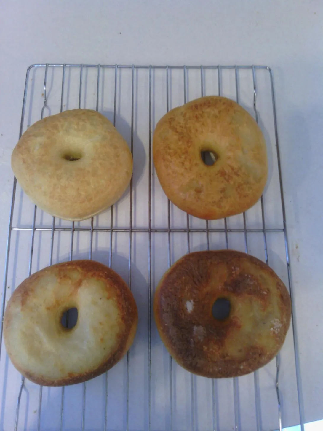 I decided to try my hand at Reinhart's bagels from BBA. Followed everything, but the only changes were AP flour, and brown sugar, instead of syrup. I used two pans, rotated, etc. I'm also high altitude, but have yet to have a problem with my other bread. Now, in the picture - top left, the 'perfect' bagel. Top right - a bigger, darker, but still good bagel. The sad bottoms are mainly my concern. Bottom right, is a bit overcooked (I went so far as to use the broiler on these poor souls), but still with mushy spots. The bottom left is all mush on top, and cooked on the bottom. I'm not quite sure what went wrong, but I'm wondering if it had something to do with the boiling? I just have no idea. Anyone else have this problem, or know how to fix it? I used just a regular sized kitchen pot with a tbs. of baking soda. I didn't think that would make a difference, guess it might? Like I said, my first attempt at bagels, though far from my first bread baking. Thanks for any help.
