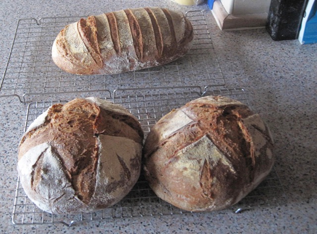 The top loaf is 100% sourdough, mainly spelt flour (wholemeal and white mix) whilst the other two are mainly white flour but with 15% wholemeal wheat, 5% dark rye and 5% nut brown malt flours. These were a hybrid dough with a 250g of white sourdough and a small amount of "fresh" yeast (it was what was left after I had thrown the blue bits away). These are gifts so, sorry, but no photos of the crumb.