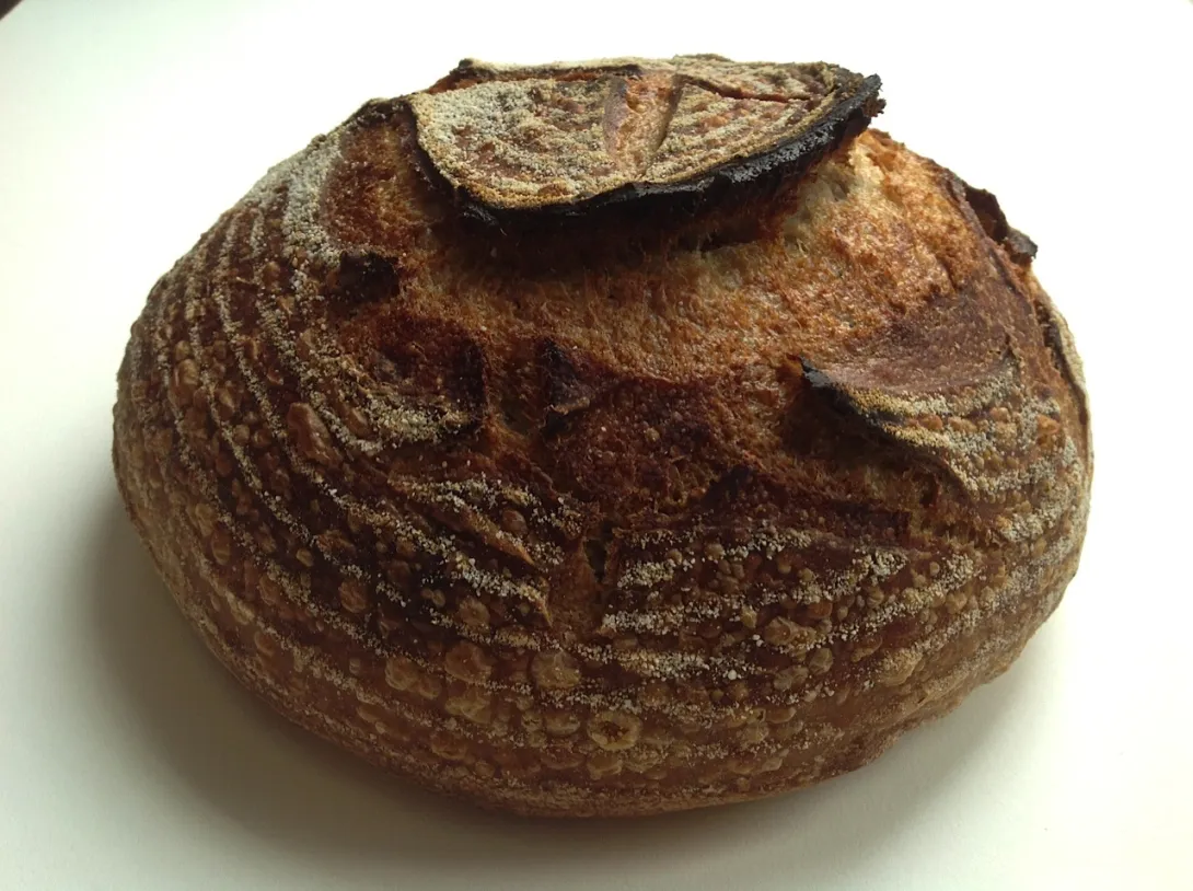 Tartine country boule, 25% Bob's whole wheat, 75% KA AP, 80% hydration.