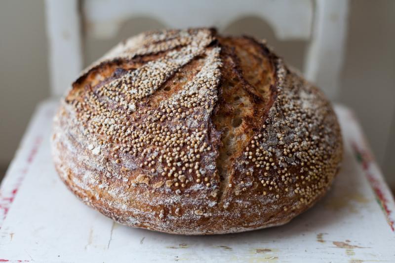 Another of the porridge breads from Tartine No. 3. For this, the millet seeds for the dough are toasted and then cooked. Having absorbed all the water from cooking, they are added to the dough after the first couple stretch and folds (an hour into the bulk ferment). Compared to the two oat porridge breads in the book (fermented and not), this one uses less of the "porridge" grains. I think it may have contributed to a lighter, airier loaf than the oat ones. It was certainly easier to incorporate the millet into the dough than with the cooked oats; the millet cooks up more like rice than oats. The crumb is soft and moist. I love the crunch of the seeds on the crust. I think this will make a really nice sandwich bread.