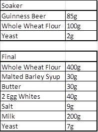 Add the malted barley syrup and butter to the milk and nuked it for 30 seconds. I stirred those ingredients until the syrup was mixed in and nothing settled to the bottom of the cup. I then added everything to the mixing bowl and use the paddle until combined. I then let the dough rest for 10 minutes before switching to the dough hook for 10 minutes on 2.
