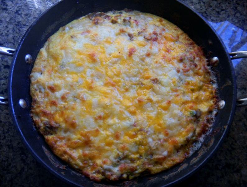 The Birthday Girl's Breakfast Fritatta has two sausages, 3 cheeses, 4 peppers with red and green onion.