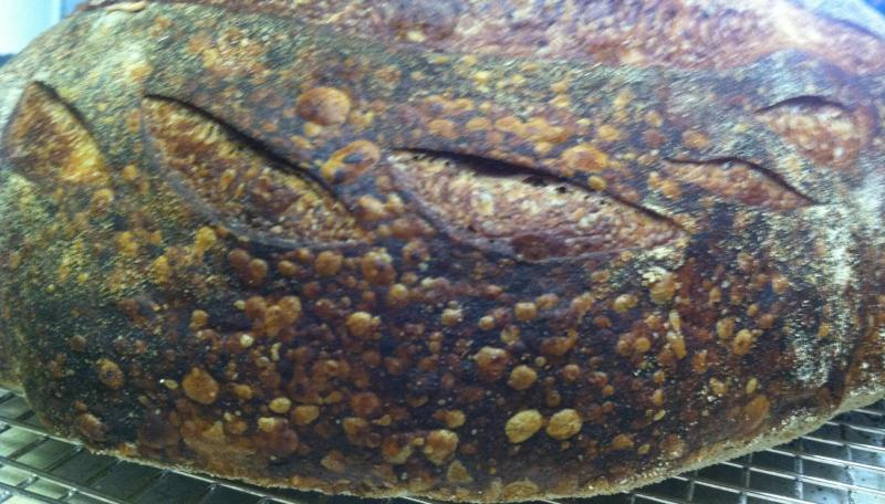 David's Miche, is a different beast all together. First off it goes through more of a shift of flavor over time. The miche. it is so large it retains its freshness for us to taste it through a longer :"curing" process. I mean the PDM stays soft and is prettty darn good just left on the cutting board for 3-4 days. But it's staling by day 3 I would say. It's flavor shifts the most from fresh to day old and then maintains. The Miche after 12 hours was sweet, really sweet and so delicious I had a few big ole slices with no adornments at all. After 24 hours its come alive with some serious sourness with a crunchy sweet chewy crust (this is a similarity but a reach i suppose) It's addictive and again with no more than just a touch of butter. The spongy crumb of the miche is so fantastic. I'm in love. I'd put this up with the PDM but in the long run the PDM wins because its got much more whole grain and I'm a sucker for anything boosted with Rye.