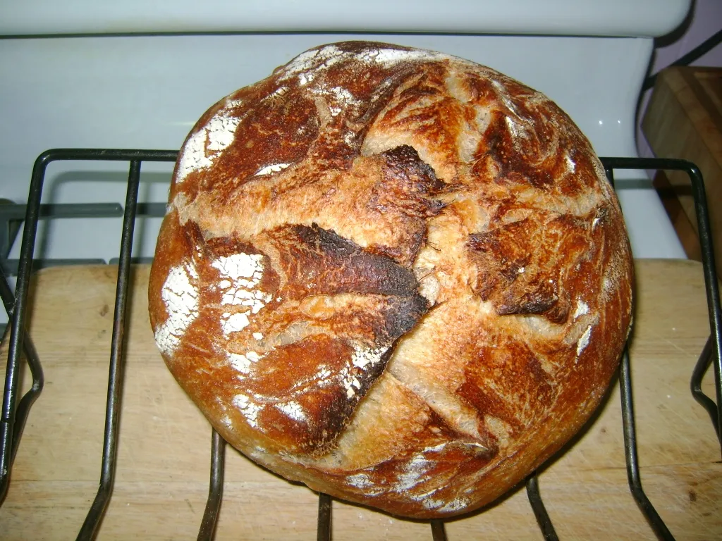70% All Purpose, 20% freshly milled durum, 10% spelt. Fed the sourdough starter in two stages with freshly milled hard white whole wheat. Baked in a dutch oven.