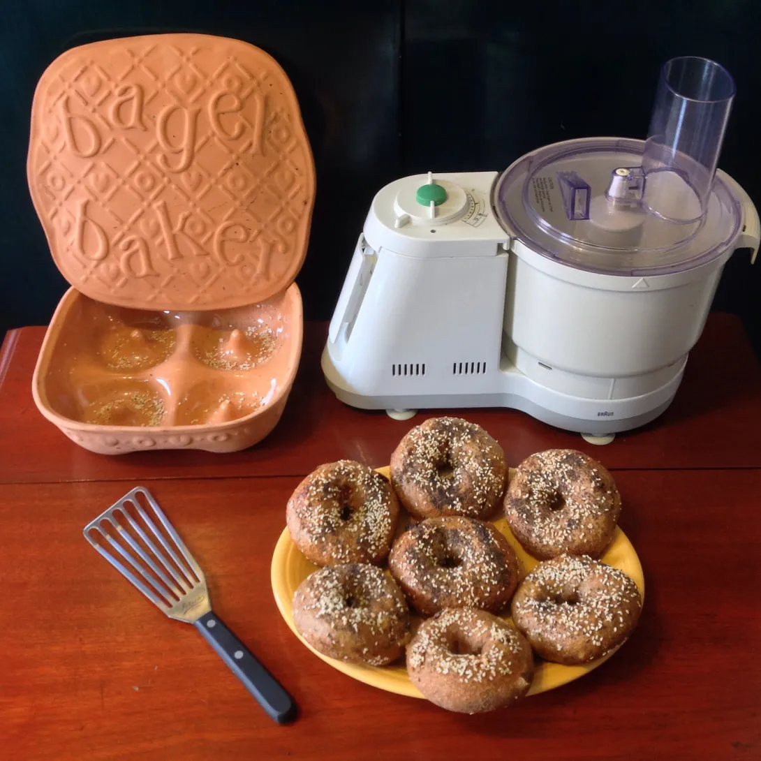 So the directions that come with the Romertopf call for soaking it 10 minutes and then placing it with the boiled bagel rings into a cold oven, setting it to 450F, and baking for 45-50 minutes. This guarantees no oven spring whatsoever. Have in my possession two of these Reco Bagel Bakers, one of which was purchased used and showing its age. Took the lid from that and seasoned its interior with peanut oil, so it would hold in moisture just like the glazed base, rather than create its own steam. Then dropped my freshly boiled rings into the Romertopf pre-heated at 450F, baked for 10 minutes at 400F and twenty at 350F. Noticeable oven spring and a more tender a crust than following Reco's directions. Still good and chewy this way, while retaining more of the flavor from the aromatic seasonings I throw into my Everything And Then Some SD Raisin Rye Bagels.
