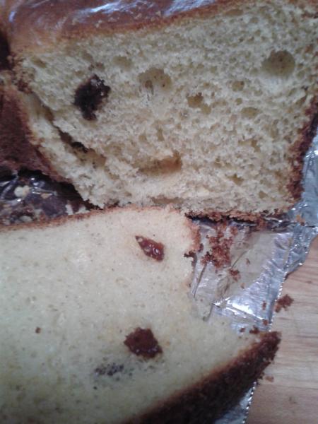 It baked up nice and brown and we waited for the sloped top this bread is supposed to be famous for - with a collapsed middle. Well it only happened in Lucy's dreams and not a problem if baked to 202 F on the inside middle it seems. It smells deliciously of anise, is sweet even though their isn't all that much sugar in it and is moist with an open crumb. The browned crust is just the best tasting part by far. Can't wait to have breakfast toast with some marmalade .....yummy!