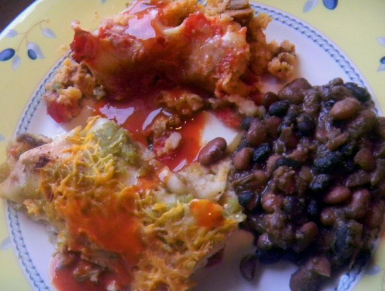 The half a red beef tamale and half a green chicken enchilada and home made mixed beans with your favorite hot sauce is a favorite around here for dinner - and Lucy says not to forget the salad.