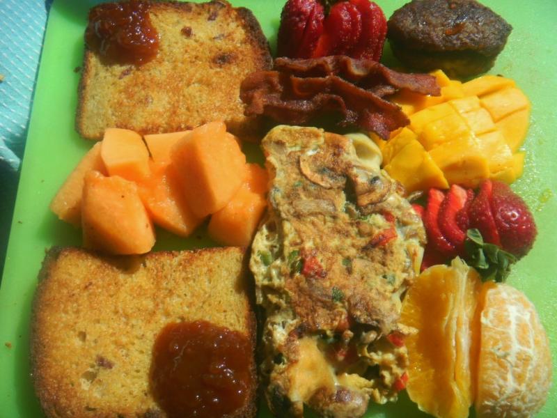 The breakfast way indeed yummy. A Denver omelet with aged white cheddar cheese, sausage, bacon, mango, strawberries, cantaloupe, half a minneola and this fine bread with home made marmalade.