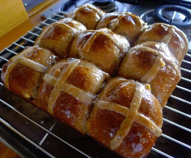 Spot on re the crosses. I bake batches of only 9 buns at a time, and can't justify making a pipe-able quantity of cross mix, so I roll the cross paste out thin on a floured bench and cut strips with a dough scraper, then lay them on the buns and brush them over with milk, smoothing with fingers when necessary. With practice over the years I've gotten quite fast, but there's no doubt pro bakers would guffaw at this painstaking method (then again, if I may be so bold, I have not tasted any commercial HCBs that come close to these ones!). And as well as being pragmatic in my domestic context, I like the results aesthetically doing the crosses this way.