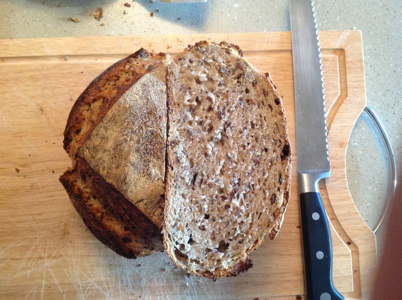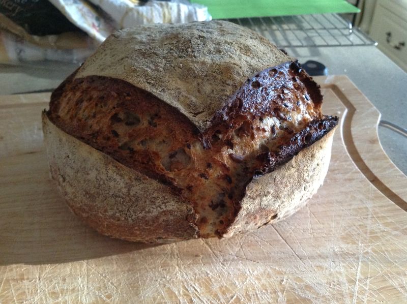 I also made a Sourdough Seed Bread. The dough felt quite firm and heavy during bulk fermentation, almost like playdough. It certainly wasn't loose or extensible, and resisted folds during shaping. I suppose the seeds absorb a lot of moisture and provide structure. This also was retarded overnight, and didn't seem to have risen much. I didn't have time to let it rest any longer at room temperature. It ended up a bit dense for my liking, but tasted quite nice. Picture below:
