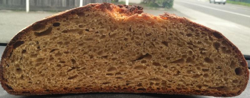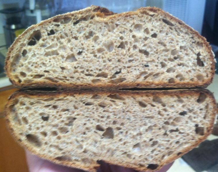 of late from dough sticking to a new basket and over proofing in the fridge twice.. Our crumb came out similar - the taste was excellent and that is all that counts after you take a bite:-) Can't imagine how good it will tastes like after an 12 autolyse though.