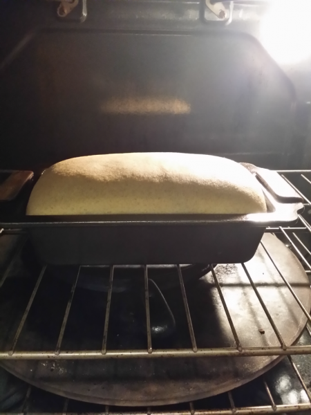 10. When you see that the dough has domed above the bread pan, turn the oven on to 350° and set a timer for 30 minutes. Be sure to start the timer once the oven alerts you that it has reached temperature.