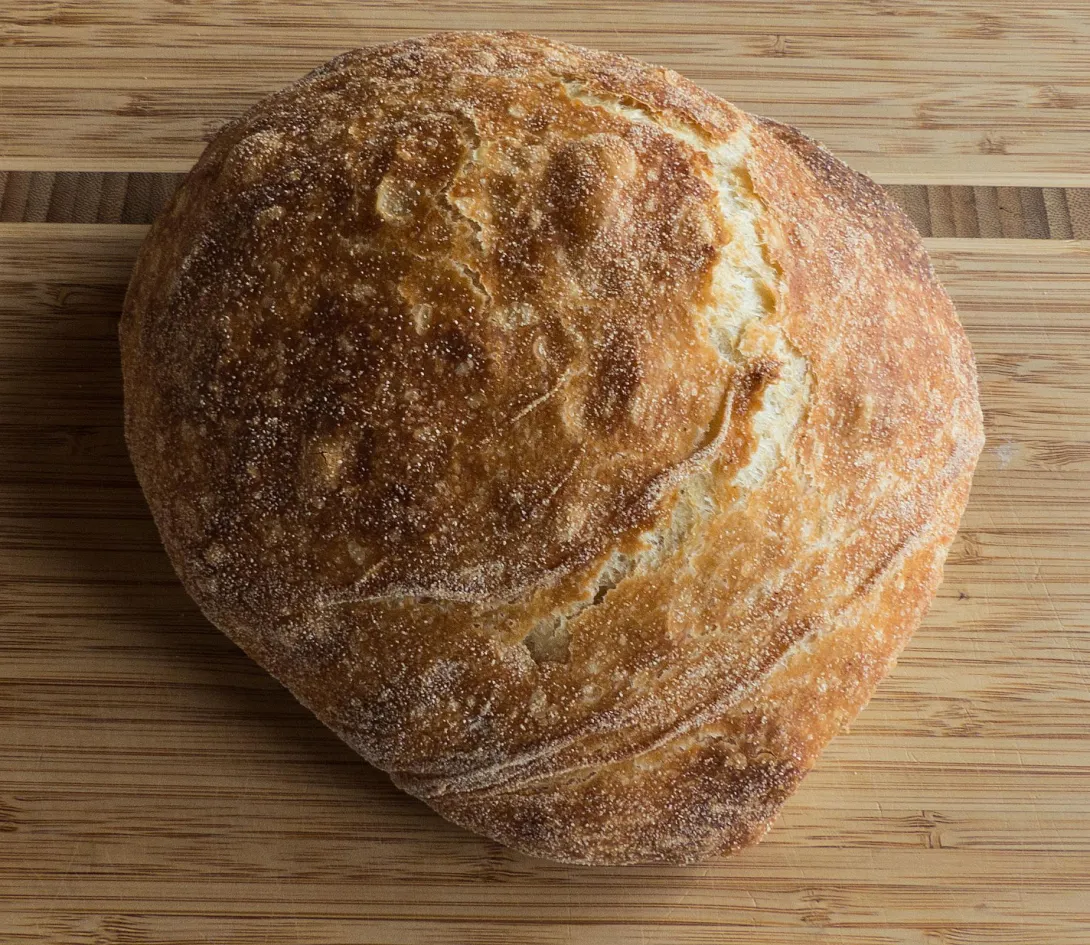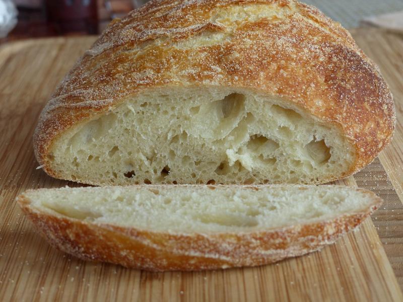 I've made Pain à L’Ancienne several times now and each time it seems to get better in terms of taste but I keep getting pretty thin boules. I've been curious about what would happen if I let the dough "age" in the refrigerator for two days instead of just one. So I mixed up enough dough for a loaf on Wednesday and left it until this morning. I also decided to try baking it in my Sassafras covered baker, La Cloche. I baked it in the convection oven at 425F for 15 minutes then lowered the temperature to 400F and continued baking for 30 minutes at which time I removed the lid and let it bake for about 8 minutes more. After it had cooled for about 45 minutes, I tried a small piece. I don't think the taste is improved by leaving it in the refrigerator for an extra day but I like how it baked in the covered baker. It also turned out a better shape, not as large in diameter but about 4" high, but I may just be getting better at shaping these things.
