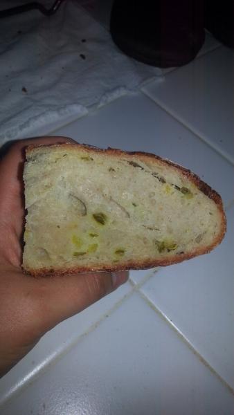 So this time, I bought some pickled jalepenos- they had no garlic. The actual dough this time looked and worked a LOT like the basic country bread in the shaping stages. I gave them a final proof in the refrigerator over night (mainly because by the time I finished shaping it was 230 am) By 1130/noon I tried baking one loaf. The texture of the crumb was slightly improved from the previous two attempts but it's still not what it should be. When that one came out looking a little sad, I tried again at around 3/330 in the afternoon with the second loaf. There was no improvement.