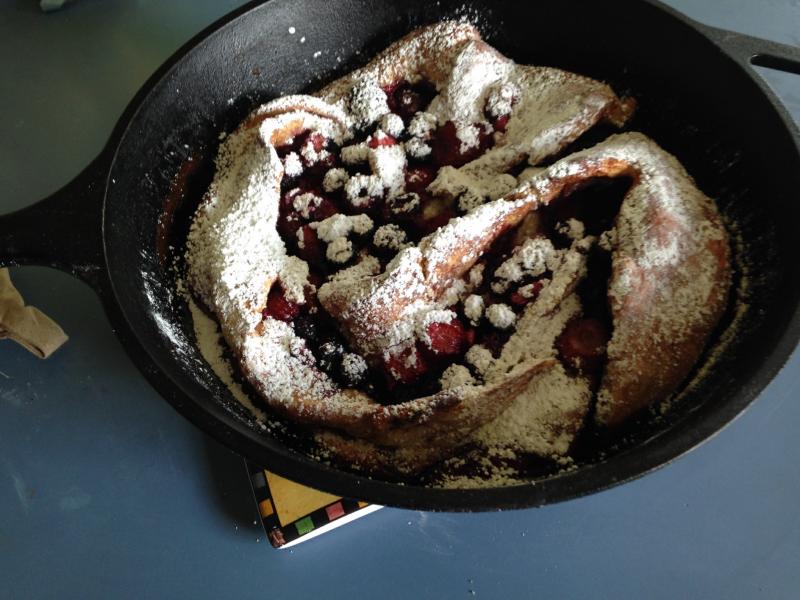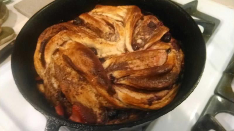 Just kidding... Actually we did snatch our recipe from the Joy the Baker's Boot Camp - Triple Berry Cinnamon Swirl bread. This bread was a twist rather than a braid... the challenge was that the dough was very soft and delicate... which made getting it into the skillet quite the challenge once it was all twisted... and me being how I am, left some juicy goodness in my fruit... making it even smooshier... LOL