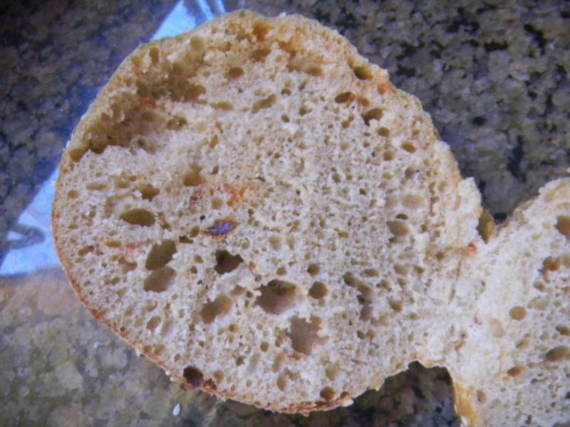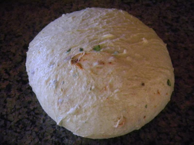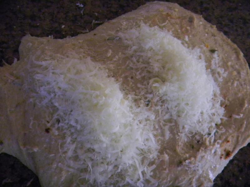 Then we did 3 sets of stretch and folds also on 15 minute intervals where the garlic, herbs, re-hydrated onions and sun-dried tomato was incorporated on the first set and the pecorino and parmesan cheeses went in on the 2nd set.  By the end of the 3rd set everything was well incorporated.