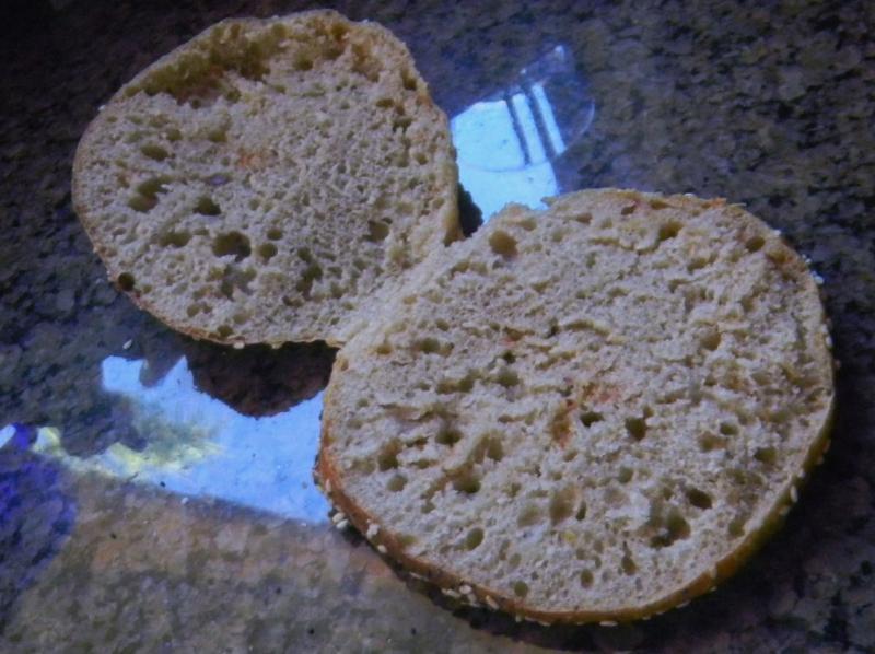They browned up well and puffed themselves up some too.  We cut one open and, even though thin, they are open, moist and soft on the inside.  Can’t taste one till burgers are grilled tomorrow night but how bad can they be?  They smell pretty tasty.  The girls will like that they are not SD for a change.