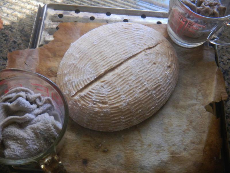 After a 15 minute rest, we pre-shaped and then shaped the dough into a squat boule, placed into a small basket, wrapped in a trash can liner and put in the fridge for 12 hours. Since we are baking in the mini oven for the summer, we need to keep the size of the dough down to 750 g or less, shaped as an oval, in order to fit well and still get (2) of Sylvia’s Steaming Cups in there too.