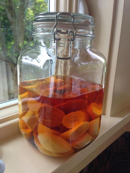 And finally, for giggles, I am making a batch of banana-infused Irish Whiskey a friend at work raves about. Easy to make -- simply cut up 3 bananas and combine with a bottle of Jameson in a sealable jar. Let it sit for 3 or 4 days, and then drain out the bananas through a fine mesh sieve, and pour the whiskey back into the bottle. Drink on the rocks with a large ice cube.