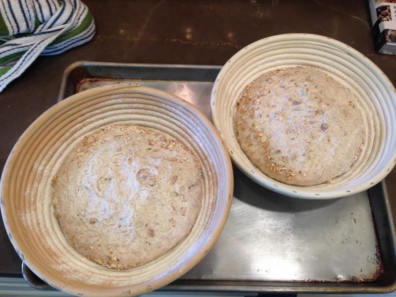 Also, I monkeyed with the final proofing time, as to adjust to our weekend schedule. After a 1 hour autolyse and then 3.5 hr bulk fermentation, the dough looked read to retard, so I put it in the fridge for what ended up being 6.5 hours (instead of a full “overnight”), pulling it out just before bed for an additional hour at room temp while the oven pre-heated. Everything seems to have come through OK, and I will definitely be playing with this recipe some more, as I’m lately fascinated with flavor and texture of porridge breads