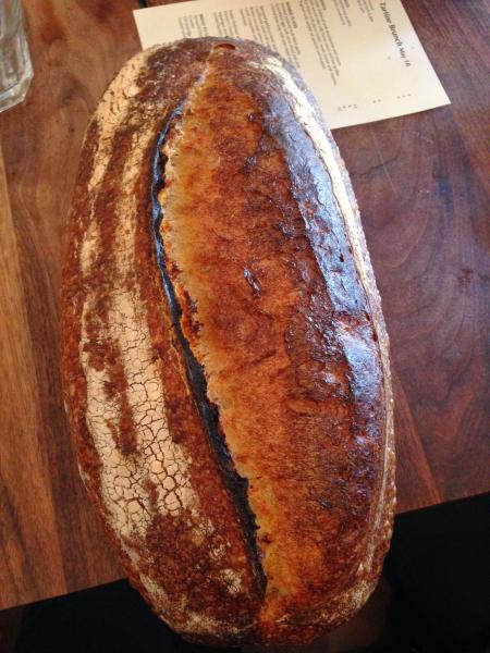 I was amazed by the size of the Country Loaf – at least twice the size of the batards I produce at home. Rather than cut into it at the restaurant, we ended up hauling this one back on the plane to Seattle and immediately froze it, to enjoy later. Later ended up being about 2 weeks, when we had steamed clams with a large group of friends that cried out for crusty loaf of sourdough. Brushed with some EVOO, grilled, it was amazing.