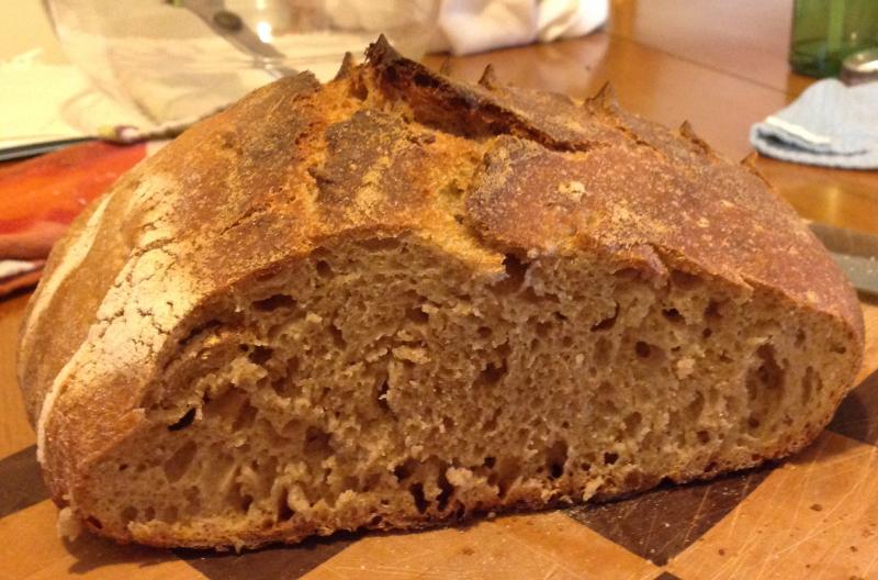 I found some spelt flour, so my third recipe was the spelt-wheat bread. Again, I did a simultaneous leaven and autolyse. Once the leaven was ready I mixed the two together, added the salt and additional 50 g water recommended by Robertson, and started my bulk ferment. Then I went online and read about how spelt doesn't absorb water as much as other flours, and that decreased hydration is recommended. Whoops. Sure enough, it was a very wet, sticky dough. Shaping was extremely difficult for my inexperienced hands. I gave it my best shot and let the dough do the final rise overnight in the fridge. When I baked it the next morning, even though it was cold it was still quite soft. It baked up OK, though I should have checked temp. The crumb of loaf #1 was very moist, almost a little tacky. It makes excellent toast, though.