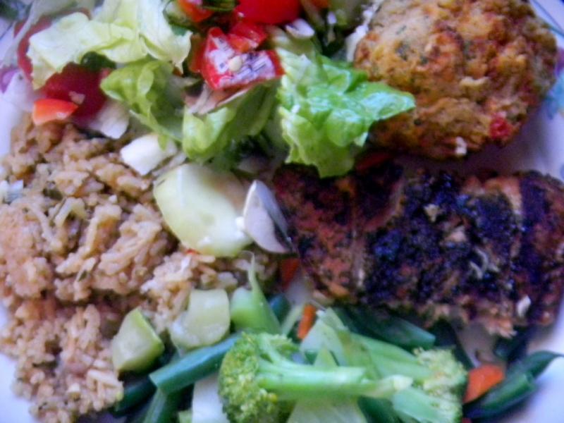 Crab cake and grilled salmon with a smoked rib tamale dinner below.
