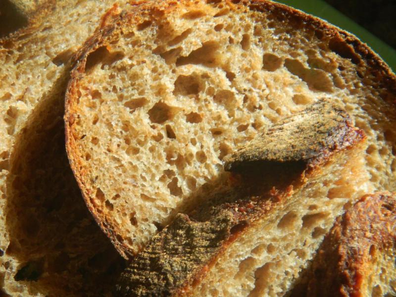 .Once it was cool we wrapped it in plastic and let it sit on the counter overnight for 8 hours. The crust softened as it rested. The crumb ended up open, soft and moist. The crust was especially tasty and the bread was lightly sour with the yeast water muting the sour as it always does.