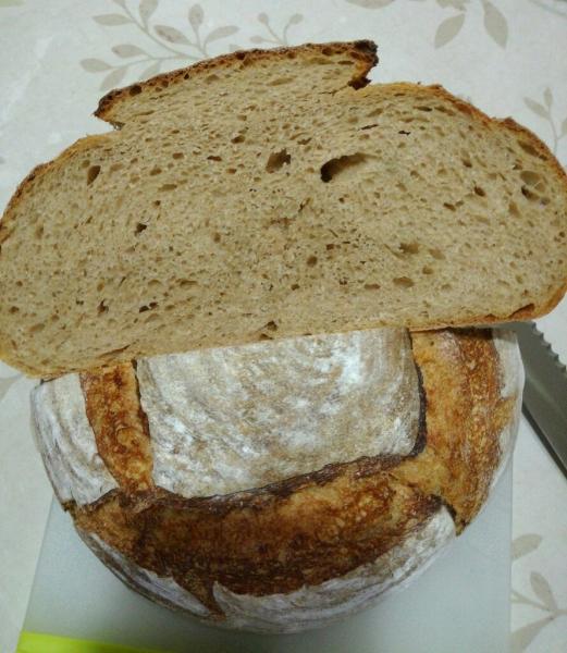 5) Baked it in a pre-heated oven with a pre-heated sassafras la cloche. 20 mins with cover, 15 mins without cover until internal temperature of 96C.