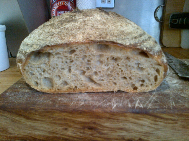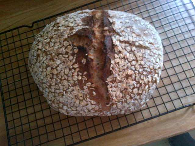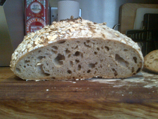 This is a definite keeper, I will add the WG next time and will probably toast it first. My niece was over so she had this as her afternoon snack on its own and with butter and cherry jam and I had some with the remains of some St. Felicien cheese. It came out mild with no sour tang which I think is better to allow the warm oaty taste to stand out, with a mellow mouth feel. It's also fabulous toasted with sardines and parsley and a little glass of St Joseph white.
