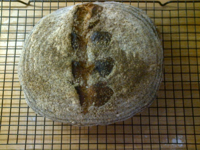 Adding the wheat germ was a good idea, it adds some depth to the flavour. This had a very mild sour tang, with the rye really coming out - David Snyder was absolutely right (as always), this bread is a keeper. This was tested with a variety of French cheeses, a Larzac ewe's cheese called L'Estaing, a fresh Italian Caprino goat cheese, a Beaufort from the Savoie region (made from raw cow's milk) which is more subtle than a classic Comte. All suitably accompanied with a glass of solid burgundy. This seems like a real "trencher" bread to me, so we're having an English classic of "devilled kidneys on toast" tonight!