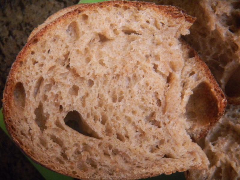 The crust softened as it cooled and this has to be the softest crumb of all time. Almost impossible to cut while still warm out of the oven –maybe that has something to do with it! The crumb was also open and moist bu8t it was the taste that stood out. Much tastier than the normal 35% whole grain wheat bread and well worth the effort to sprout and dry the whole berries first. We like this bread a lot and my wife might not find any left when she gets home.
