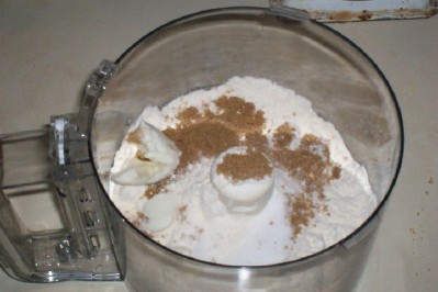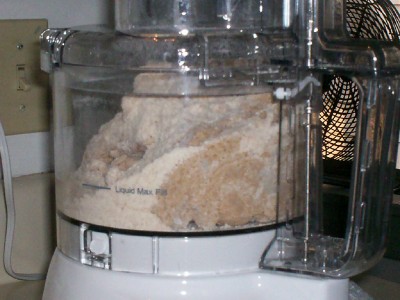 The metal chopping blade was removed and replaced with the plastic dough blade. The roughly mixed dough is then dumped in the food processor work bowl as shown below: