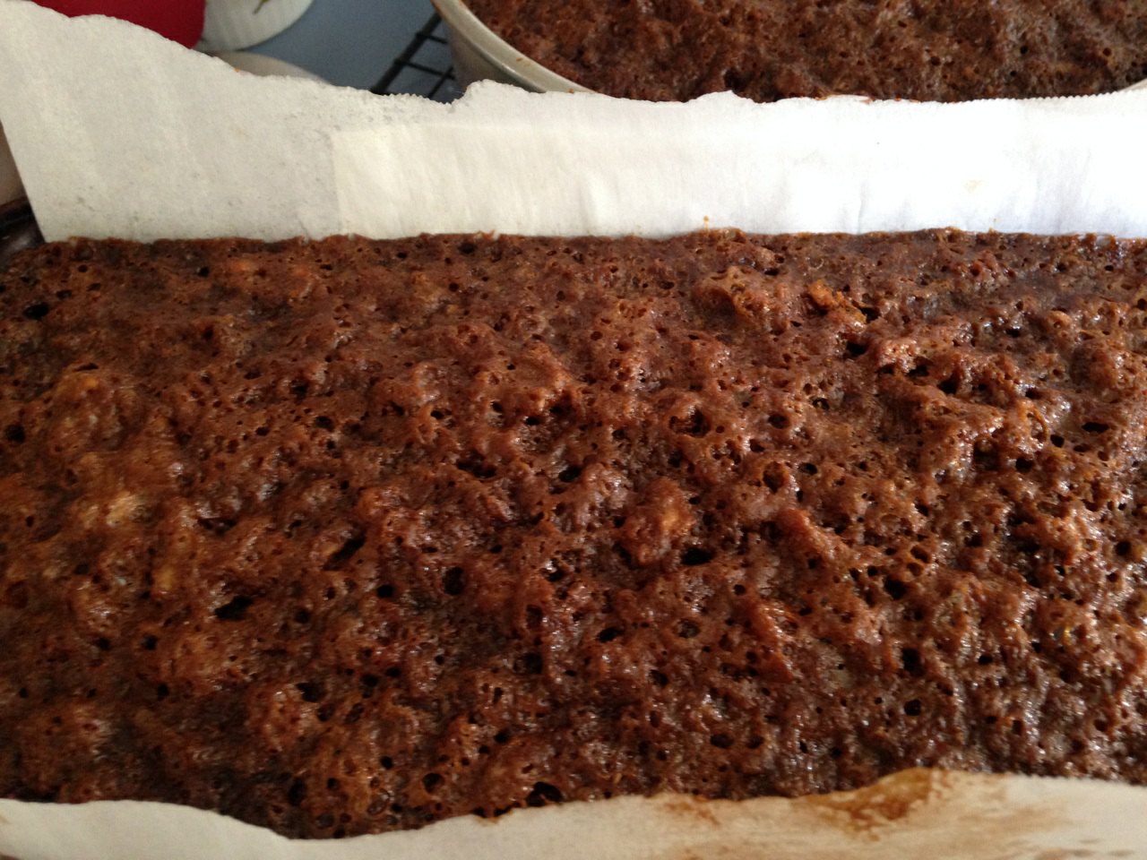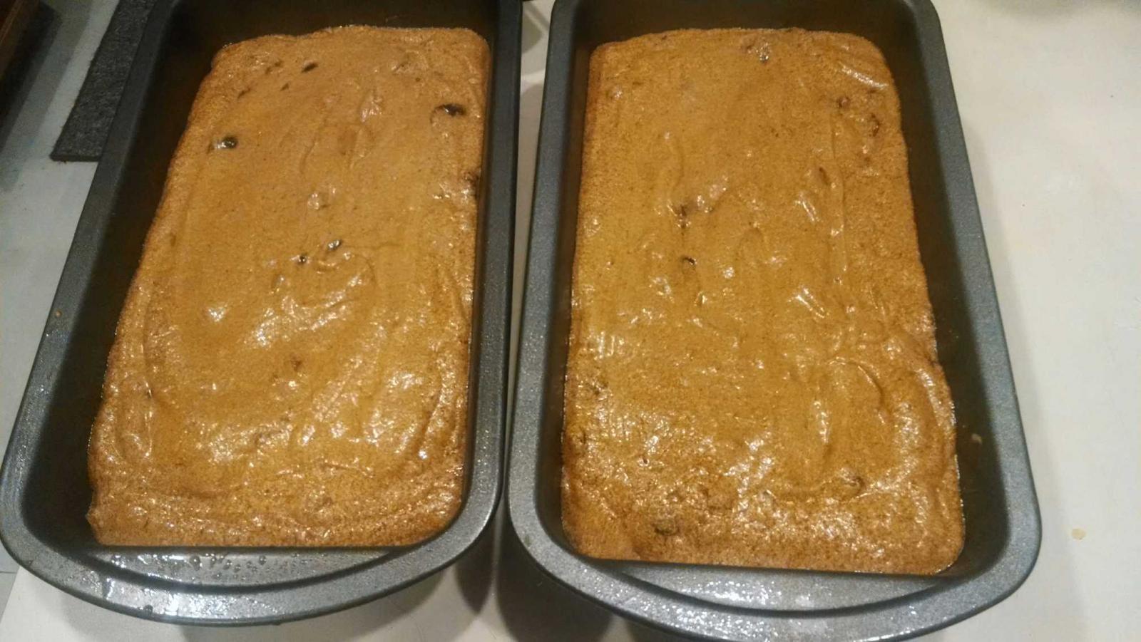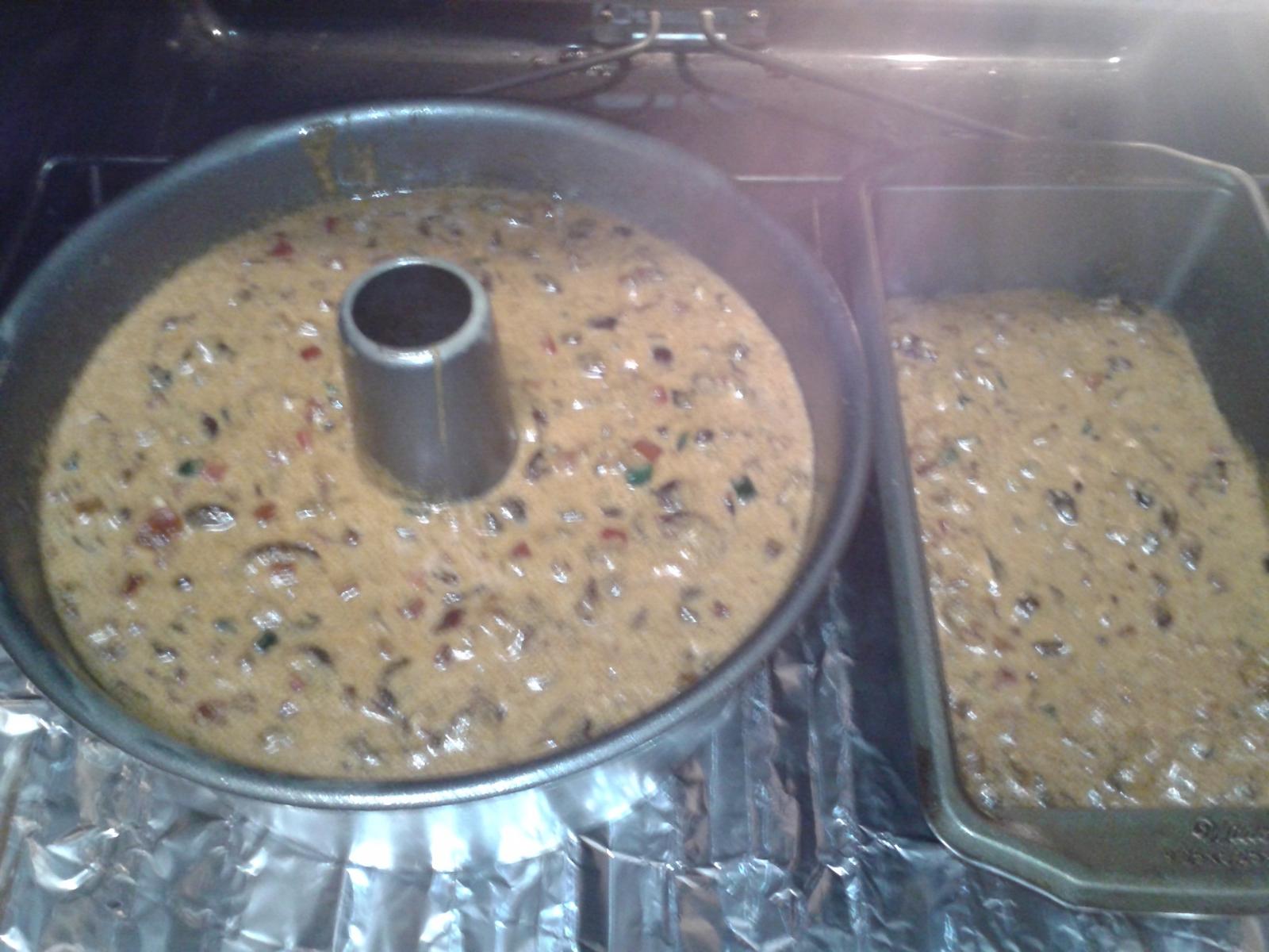 This year's double recipe was really simplfied: basic ingredients plus 680 g raisins, 325 g walnuts, 1814 g fruit and peel mix, 1 cup plum brandy. It yielded a large and a medium sized springform pan and a loaf pan. All filled almost to the top came out to be a total for the three cakes of 12.5 pounds.