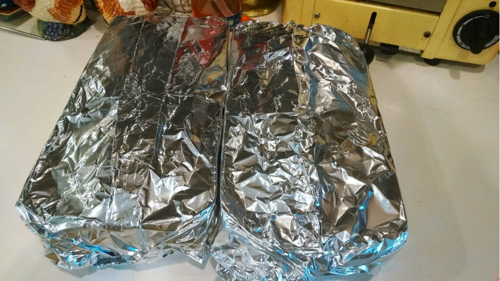and then mine is all wrapped up... the lead in picture is my round one that is in the can... it weighs 6.75 pounds, single recipe in tube pan with about an inch in a loaf pan for sampling.