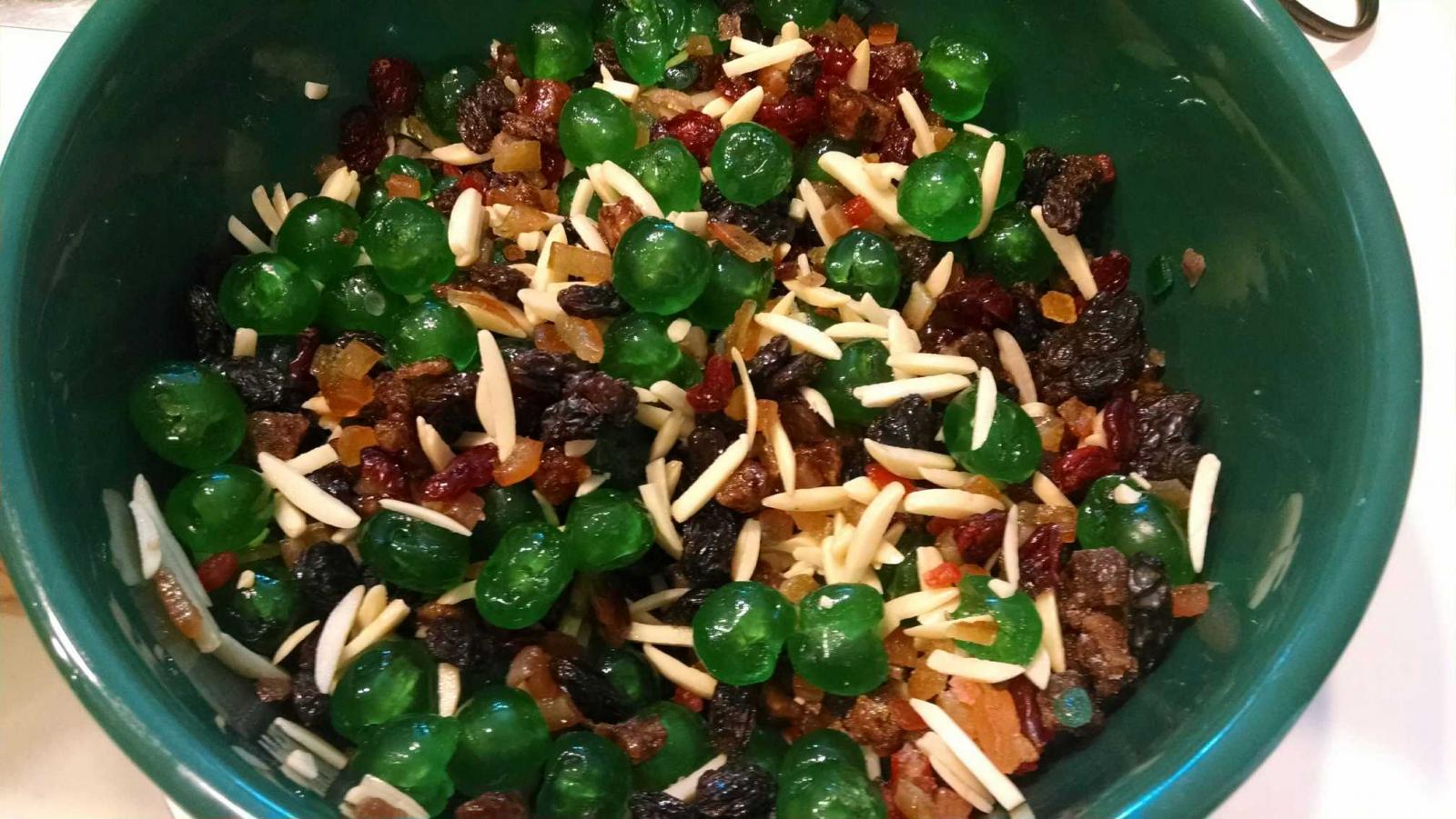 The first print out I have is from 2003, then another from 2008. Both are covered in post it notes of amounts and types of fruit, nuts, and flour used for that year. Basically what I do is add up the weight of fruits and nuts in the recipe and then make up my own mixture of what I have on hand and can find at the store. I think it is mostly a pound cake recipe with the fruit and nuts added. I don't use dates anymore, although I like the taste they seem to kind of dominate the taste of the other fruits. The fruits and peels aren't in the stores here yet so I ordered two 32 oz containers of English Fruitcake mix from Amazon. Pleasantly surprised to find them in small dice size and not overly gloppy with sugary syrup. My much more creative (and younger:) sisters make their own candied fruit.