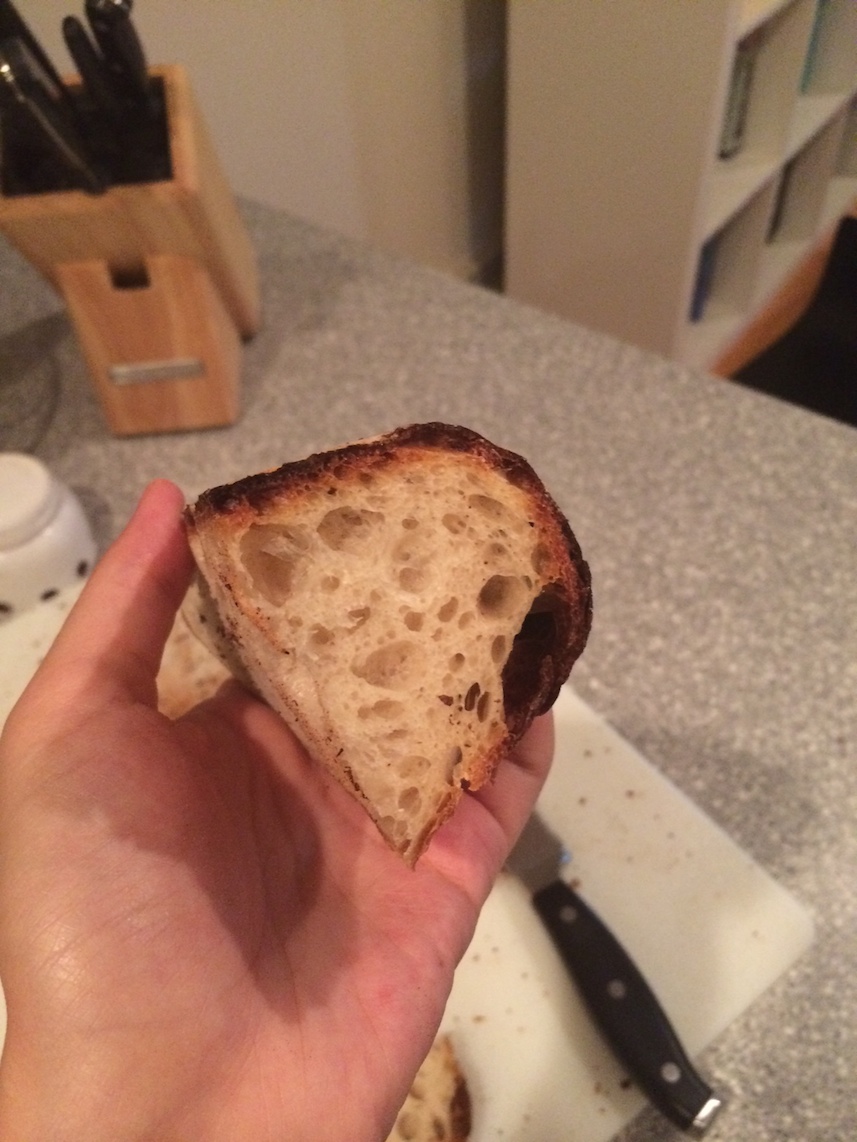 Final note/plea for wisdom: lately I've been enjoying baking my boules in an enameled cocotte, which is so much easier than those crazy lengths we all go to in order to "create steam," but I am finding that the bottom of the bread gets a bit too black. Not to the point of burning, but it's problematic if I want to make toast. Does anyone have a way of getting around this? Here is a shot of a blackened bottom (I'm holding the bread upside down):