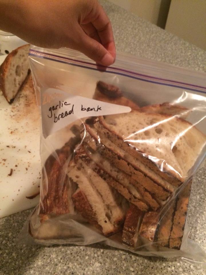 No great crumb shots, unfortunately, but you can get a bit of a sense from this pic of my garlic bread stash. This is the blander of the two boules that I make; I prefer to save the sour, richer one for plain eating: