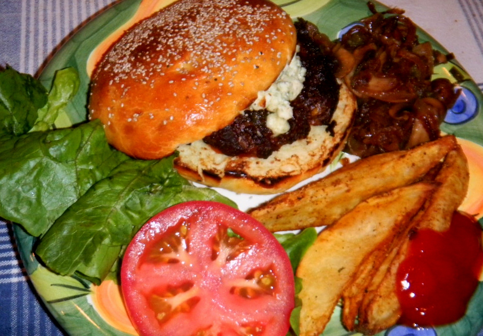 You just pile the stuff in it and on it and next thing you know it won't fit in your mouth. I forgot to say I did put dark soy sauce on the burger as a marinade with pepper, garlic powder and onion powder. Very tasty with that bun.