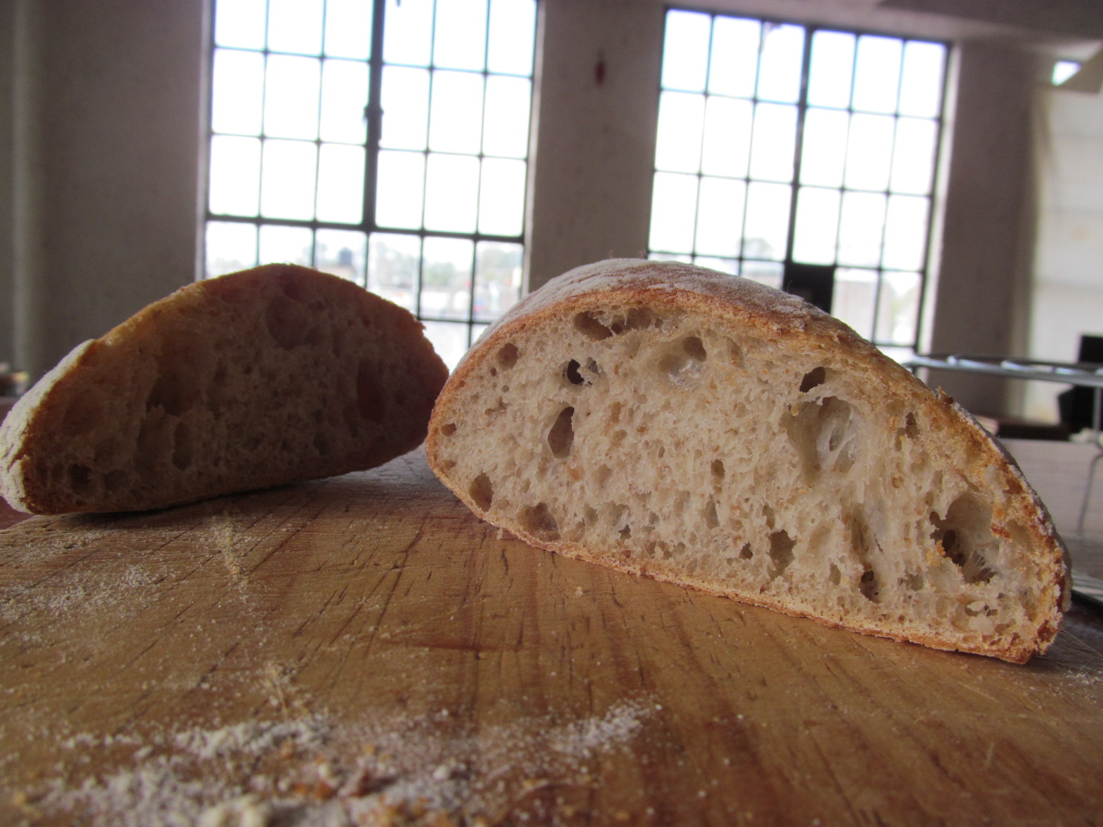 But even so, there was a nice oven spring, the crust is crusty enough, the crumb is light and rather open and the flavor is there, wheaty and slightly sour. It was not a very succesful experiment, but it will not go uneaten either!