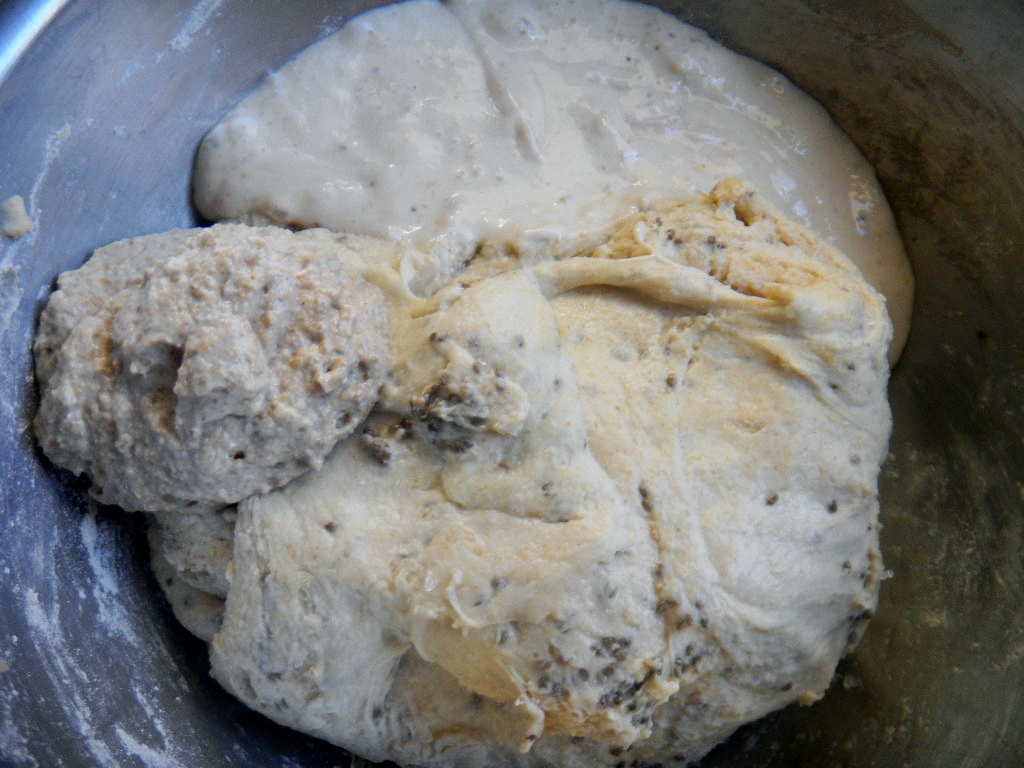 Since this loaf was so big, it wouldn’t fit under our largest DO bottom used as a cloche so we had to bake it on the stone in BOB using Mega Steam. We also included the 2 week soaked chia seeds in the autolyse this time instead of adding them in before the slap and folds.