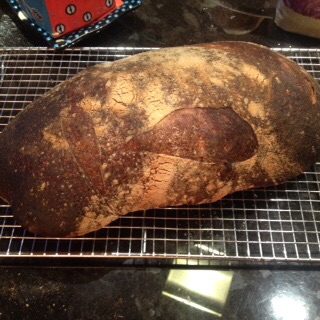 Second one I baked when I got home. It deflated a lot as I moved it into the dutch oven, and it's risen rather wierdly with a sort of ledge where the outside first touched the hot inside of the dutch oven, so I thought all was lost, but the crust is brilliant and although it's a bit dense, it's quite edible.